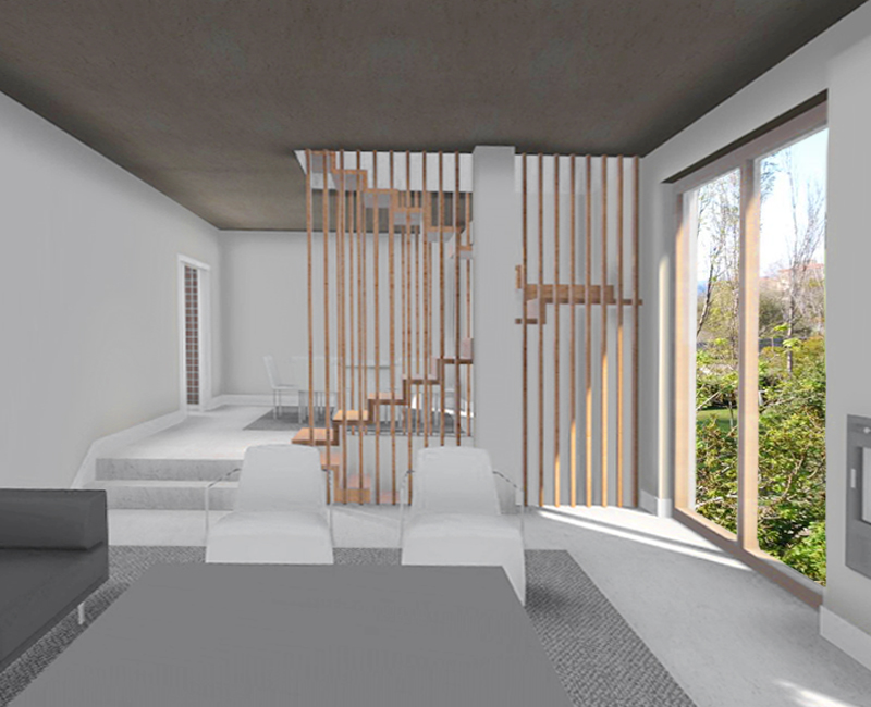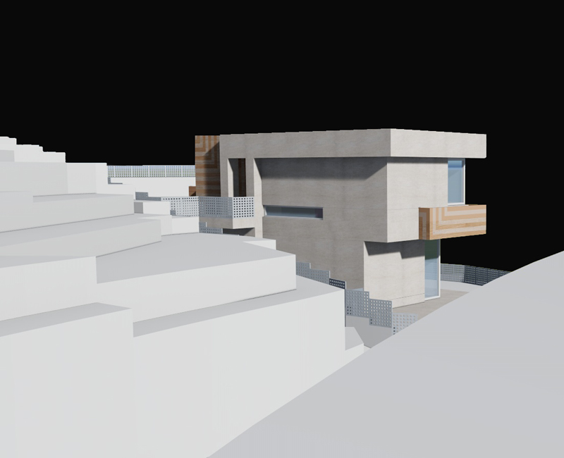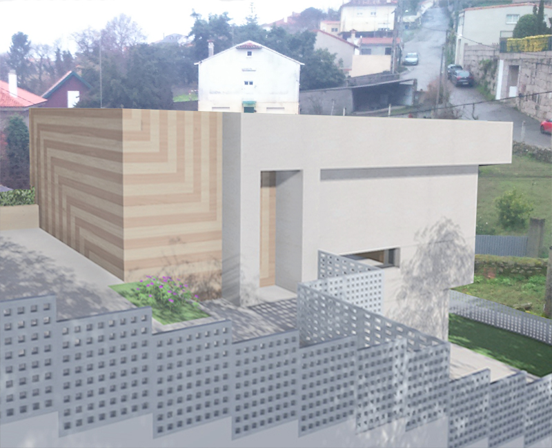 Es una pequeña vivienda unifamiliar en un terreno elevado de aproximadamente 250 m². Se busca una imagen dinámica que amortigüe el efecto vertical del emplazamiento y la altura propia de la edificación.