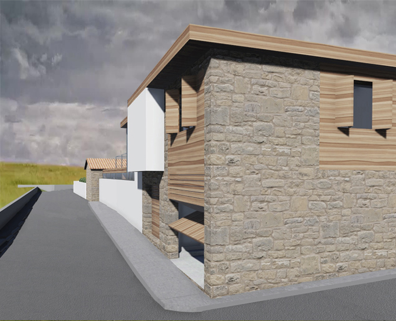Esta segunda residencia está destinada a una familia de artistas residentes en Madrid. El mantenimiento de las preexistencias el disfrute del espacio exterior y la privacidad son los ejes vertebradores del proyecto. Lo más destacado es el nexo de unión entre las dos construcciones. En este elemento apoyado en el muro exterior se dispone la cocina y generamos un patio a modo de comedor y sala exterior.
