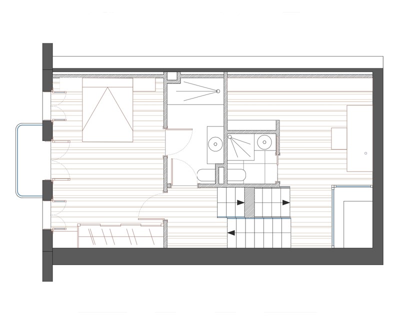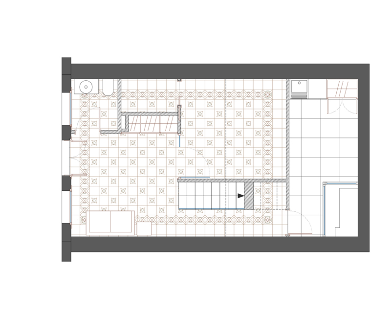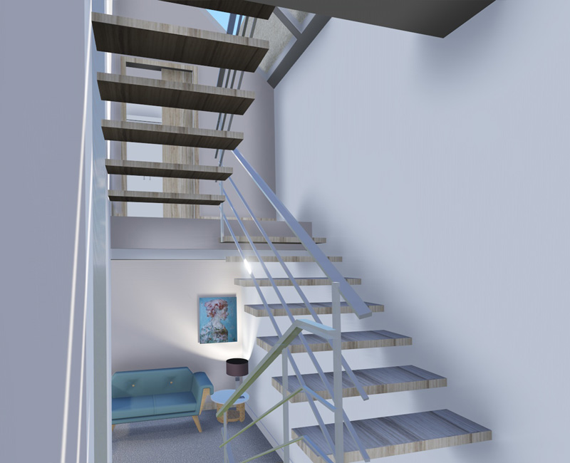 En los estrictos límites de la edificación actual , con una única fachada, y en un vial con limitaciones al trafico, se proyecta una vivienda de dos dormitorios, y amplias zonas comunes. Se parte de un nivel de forjados inamovibles en el frente del edificio y se escalonan las plantas en la parte trasera para una mejor iluminación y ventilación de las mismas . Esto se potencia gracias al techo acristalado de las escaleras y un pequeño patio anexo a las mismas, donde se mantienen los restos de las lareiras.